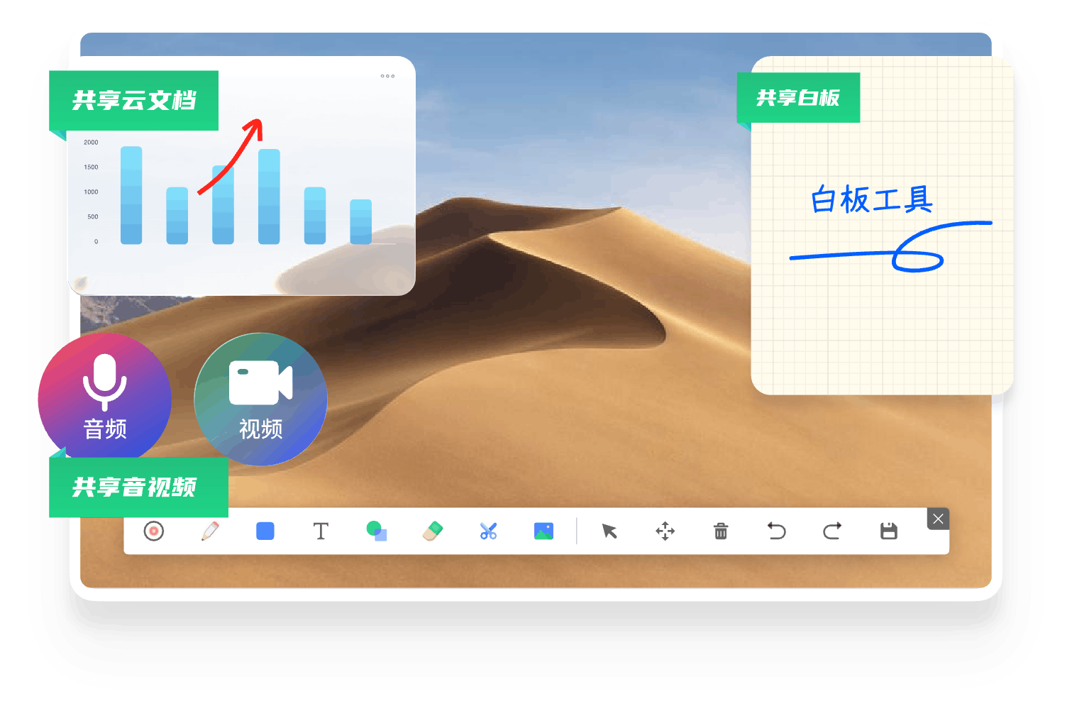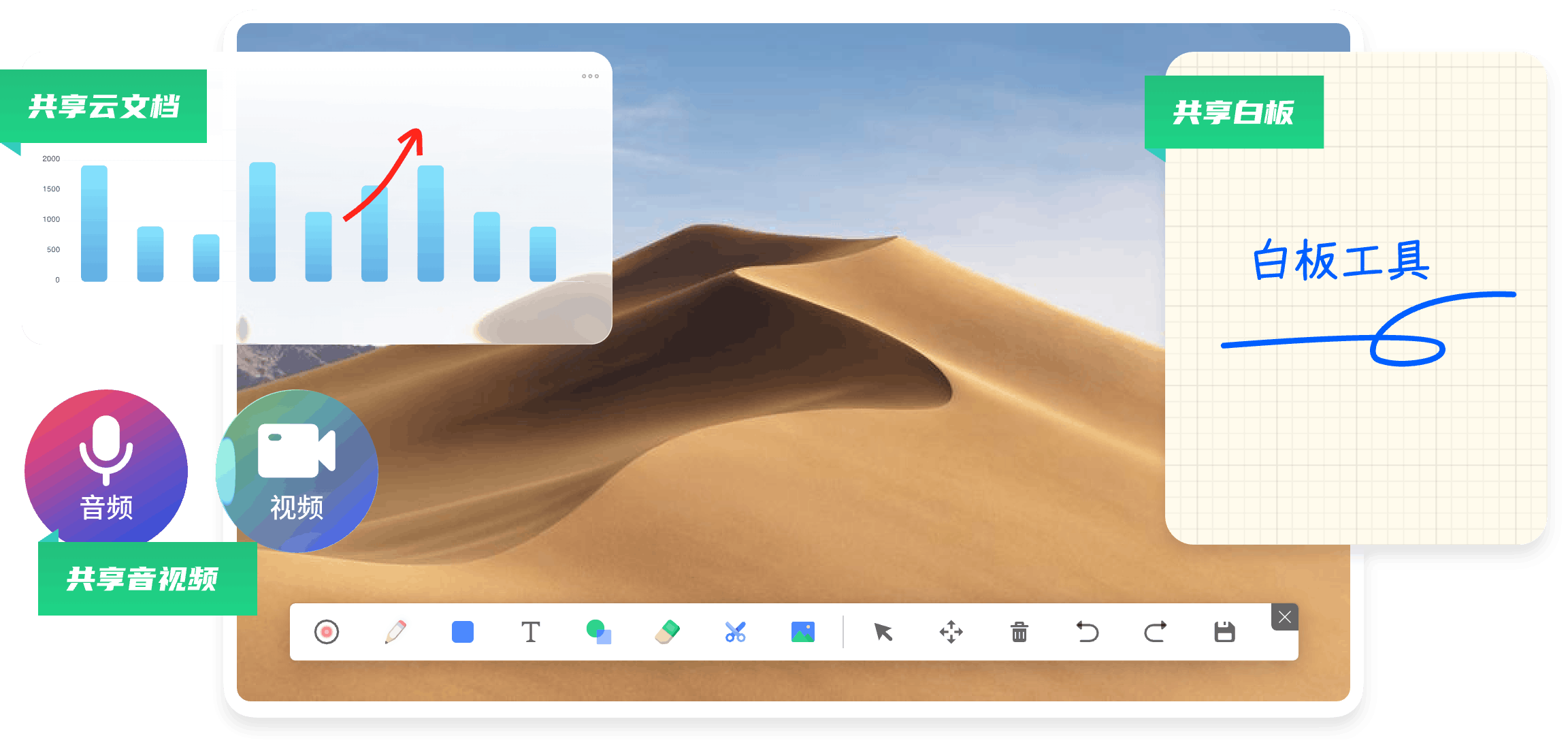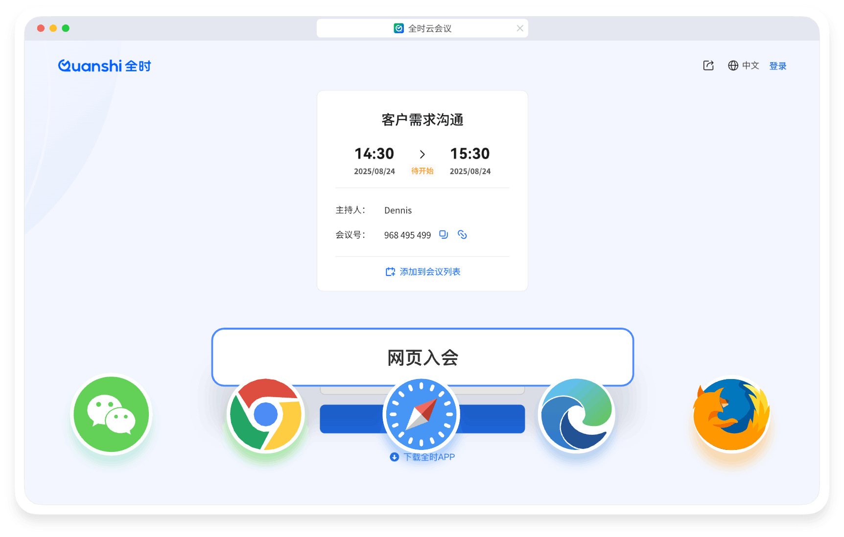 全时云会议的优势 免下载免安装网页入会 无需下载客户端,网页加入会议,支持微信浏览器、Chrome、Safari、Edge、Firefox 音视频共享更顺畅 视频更清晰、流畅 自研SVC,可根据机器情况、网络情况和观看者屏幕分辨率动态调整编码层数、分辨率兼顾清晰度、流畅度和带宽占用。 音频原声无损伤 自研AI降噪算法超强,智能精准识别消除超百种背景噪声;AI回声消除算法也优,1024ms内回声全消,抑啸叫且护原声。 更多共享方式 电脑支持多种共享:桌面自定义区域/白板/本地音视频共享手机支持屏幕共享、支持远程控制。 不限参会终端 兼容 Windows、iOS、安卓、鸿蒙系统,电脑和手机都适用 不限录制及纪要 会议实时录制,通过AI智能总结生成纪要,根据主题、参会者、章节分类 共享一切 手机共享桌面、白板、云文档及音视频,可协作批注,保存及分享 300家全球500强企业都在用 873 次浏览