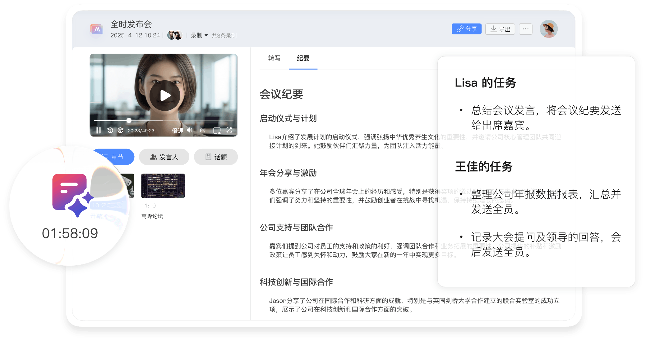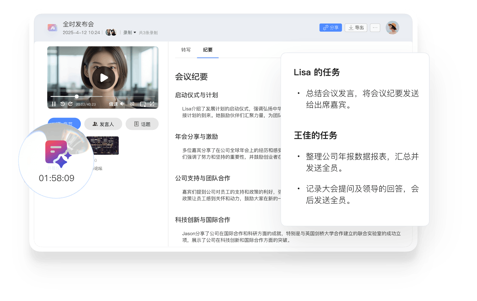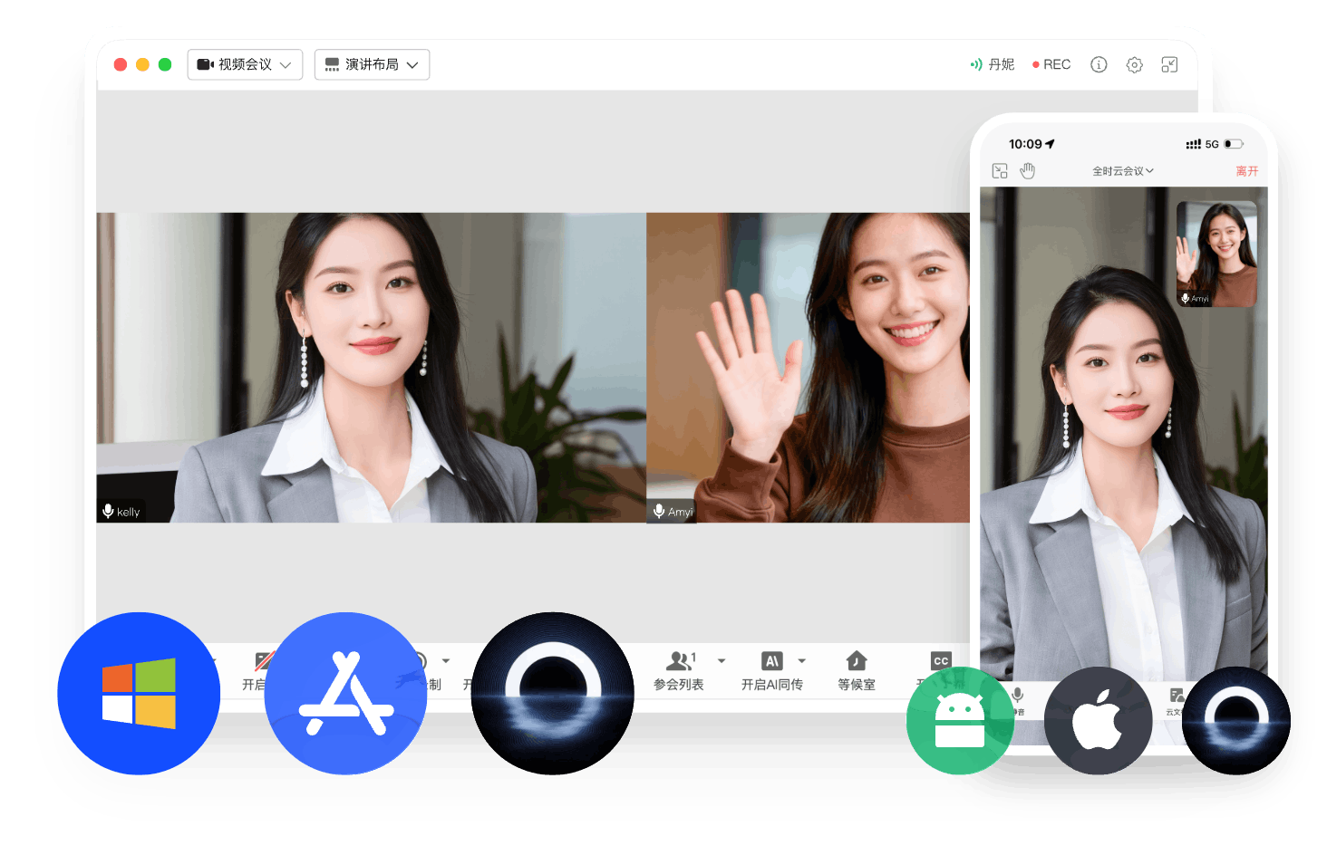 全时云会议的优势 免下载免安装网页入会 无需下载客户端,网页加入会议,支持微信浏览器、Chrome、Safari、Edge、Firefox 音视频共享更顺畅 视频更清晰、流畅 自研SVC,可根据机器情况、网络情况和观看者屏幕分辨率动态调整编码层数、分辨率兼顾清晰度、流畅度和带宽占用。 音频原声无损伤 自研AI降噪算法超强,智能精准识别消除超百种背景噪声;AI回声消除算法也优,1024ms内回声全消,抑啸叫且护原声。 更多共享方式 电脑支持多种共享:桌面自定义区域/白板/本地音视频共享手机支持屏幕共享、支持远程控制。 不限参会终端 兼容 Windows、iOS、安卓、鸿蒙系统,电脑和手机都适用 不限录制及纪要 会议实时录制,通过AI智能总结生成纪要,根据主题、参会者、章节分类 共享一切 手机共享桌面、白板、云文档及音视频,可协作批注,保存及分享 300家全球500强企业都在用 873 次浏览